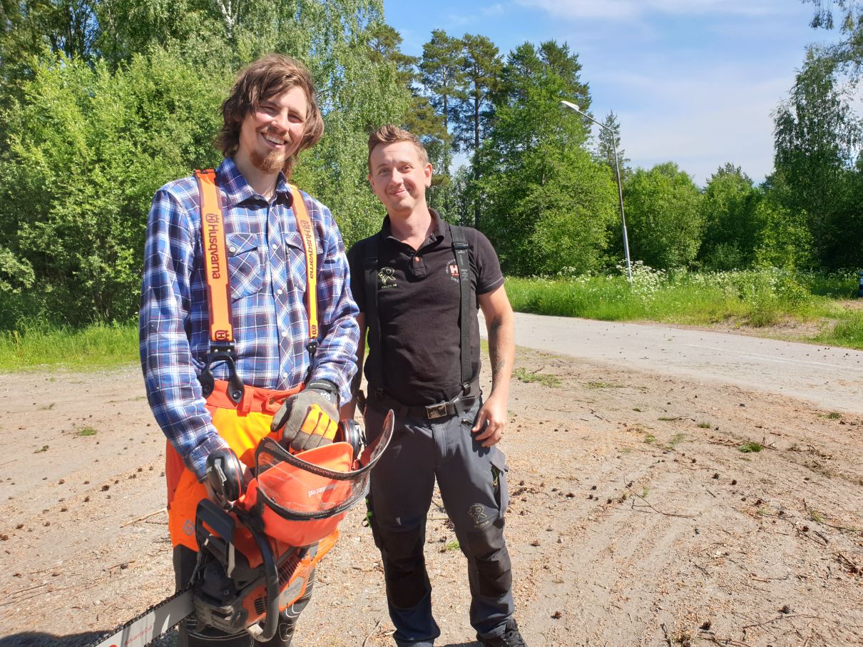 Innan trädfällningen ser vi till att avlägsna buskar, kvistar och småträd som kan vara i vägen för att kunna arbeta obehindrat och se till att ha en flyktväg när trädet väl faller.
